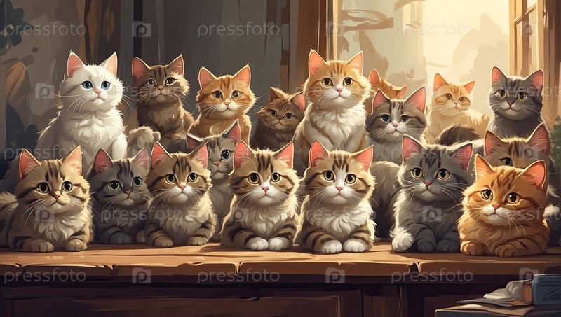 Теплая уютная толпа кошек, мультфильм? детский стиль, светло-бежевый цвет, домашние обои, декорация для детей, дружественный к животным, еда, брендинг заботы