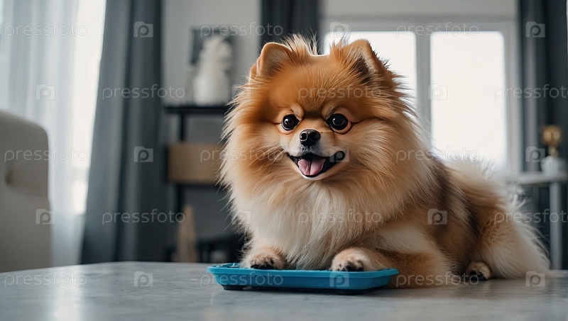 Happy groomed pomeranian at pet salon table ? машина для ухода за домашними животными, пуховой контроль, ножницы породы, спокойное животное, стильный декор
