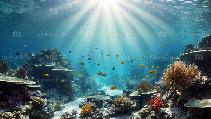 Разнообразие рыб и кораллов, солнечный свет под водой - образовательная семейная экскурсия, баннер охраны моря, удивительный фон дайвинга