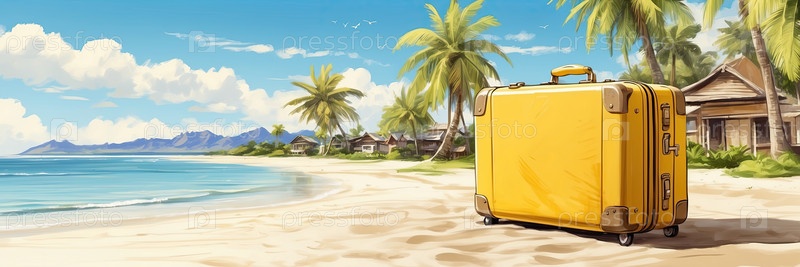 Песчаный курорт, чемодан, пальмы ? летняя поездка, обложка журнала путешествий, плакат направления, распродажа отдыха, объявление о отеле, туристический центр