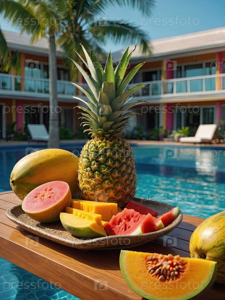 Гуава, папайя, манго тропические фрукты, фон бассейна отеля ? завтрак-бар, меню путешествий, реклама оздоровительных каникул, брендинг гостеприимства