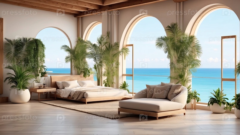 Элегантная средиземноморская квартира с арками и пальмовыми растениями, окном на берегу моря - дизайнерский прибрежный апартамент, изображение путешествий и гостеприимства