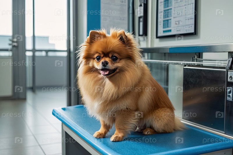 Помераньян на синем экзаменационном столе ? осмотр питомца, больница, медсестра по уходу за собой, вакцинация собак, визит к врачу, стресс или спокойствие