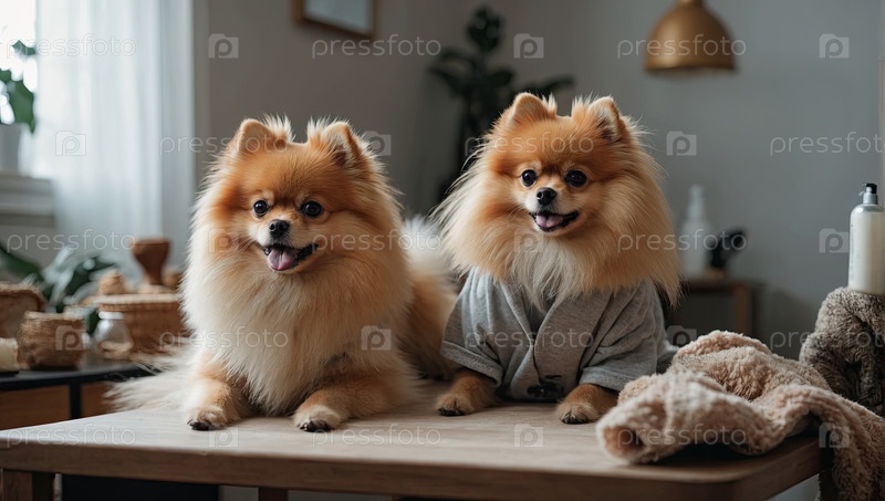 Два померанца после ухода за собой - друзья с пушистыми подстриженными пальто, стильный салон, аккуратная отделка, счастье, забота о владельце