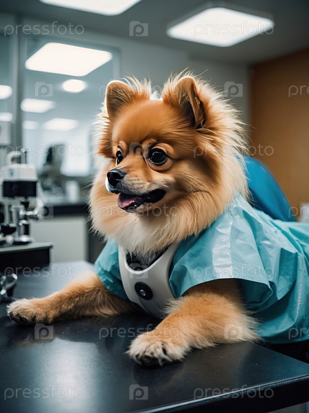 Собака в синем жилете за столом ветеринарной клиники - осмотр, назначение, скрининг сердца, спокойный питомец, вакцинация, проверка здоровья