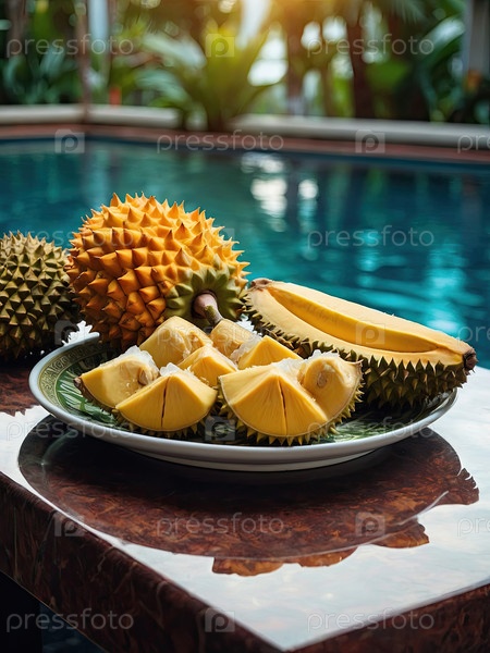 Дюриан, ананас, апельсин на тарелке у бассейна - тропическое приветствие, брендинг роскошных отелей, здоровый туризм, реклама ресторана