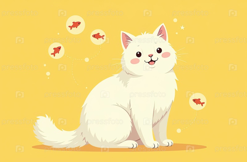 Кошка сидит и мечтает о рыбе, плавающие значки - желтый рекламный фон, пища для домашних животных, продвижение здоровых закусок, добавление текста к баннеру