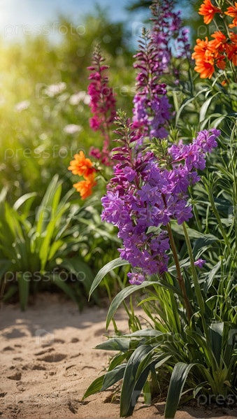 Летний сад, цветущие фиолетовые и розовые цветы - вертикальный цветочный фон, шаблон приветствия, пространство для текста внизу
