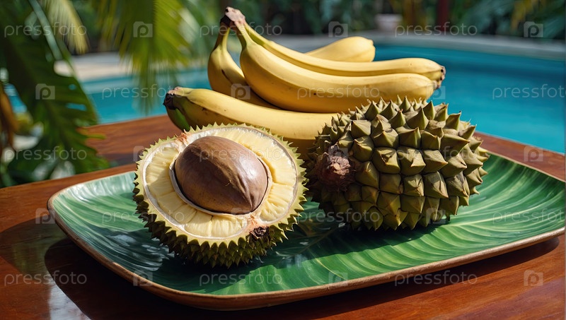 Экзотические фрукты с бананами, питайей, дурианом - летняя здоровая закуска у бассейна, оздоровительный образ жизни, объявление агентства тропической еды