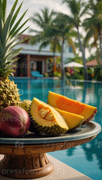 Тропические фрукты за круглым столом, отель с видом на пальмы - закуска в курорте, летняя еда, концепция оздоровления, брендинг туристического завтрака