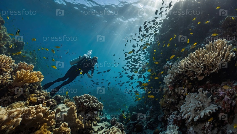 Подводный фон: дайвер, коралловый риф, яркая рыба - морская экскурсия, иллюстрация безопасности, туризм, экологическая осведомленность, впечатление биоразнообразия