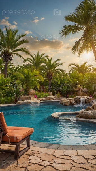 Бассейн роскошного отеля, пальмовый сад ? солнечный путешественный шаблон, фоновой снимок отпуска, широкая вода и каменная зона для текста