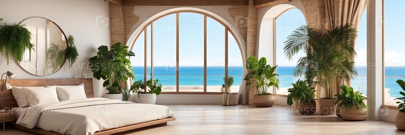 Вдохновленная средиземноморским стилем квартира с арками, мягкой мебелью и видом на море - расслабляющий интерьер отеля для путешествий, оздоровления и курортного пребывания