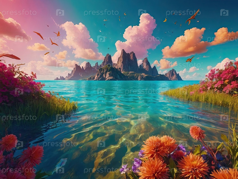 Тропическая лагуна, розовое небо, отражение, цветочный пляж ? закаты летний баннер, дизайн открытки, место для заголовка или текста