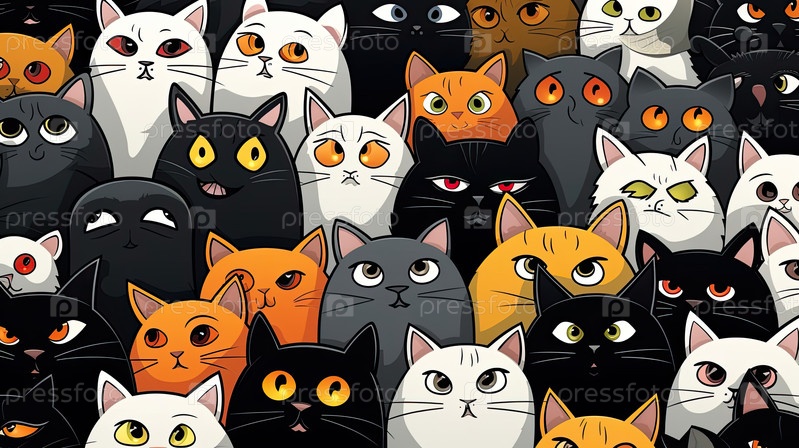 Черно-бело-оранжевый рисунок карикатурных кошек ? винтажный стиль, хипстерская тенденция, печать домашних аксессуаров, реклама еды / питомцев, упаковка, подушка