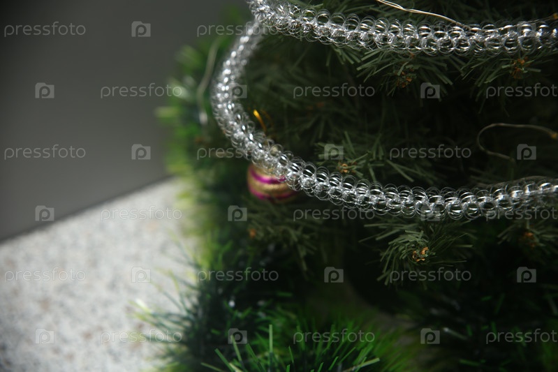 Новогодняя елка, стеклянная новогодняя игрушка на ней и блестящая мишура. Крупный план