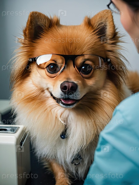 Помераньян в очках с ветеринаром - диагностика породы, умный питомец, без стресса, оздоровление, клиническая проверка здоровья, осмотр уха / глаз