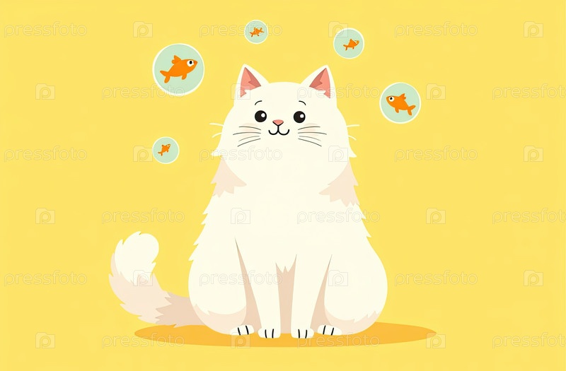 Пушистый кот с пузырями, символы синей рыбы - желтая реклама, мысль о еде, место для употребления пищи текст, баннер ветеринарного журнала, питание домашних животных