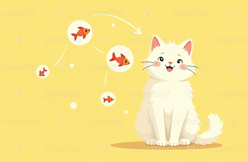 Белый котенок думает о рыбьем корме ? летящие пузырьки с иконой, желтый рекламный фон, концепция питания для кошек, промо-баннер, текстовое пространство
