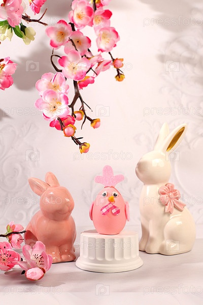 Концепция "Счастливая Пасха", абстрактная пасхальная композиция с праздничными кроликами и окрашенными яйцами на элегантном кухонном столе на фоне весенних вишневых цветов, баннер для приветственного сообщения