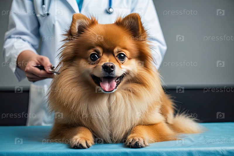 Помераньян получает вакцину у ветеринара - инъекции, профилактическая медицина, спокойный или нервный, вакцинация щенка, осмотр