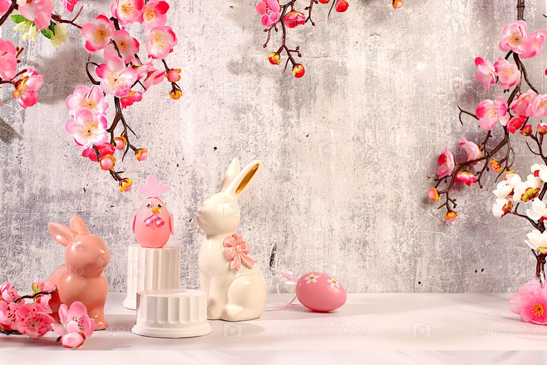 Концепция "Счастливая Пасха", абстрактная пасхальная композиция с праздничными кроликами и окрашенными яйцами на элегантном кухонном столе на фоне весенних вишневых цветов, баннер для приветственного сообщения