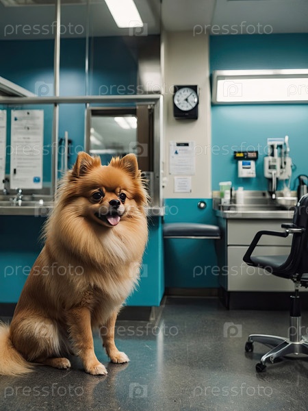 Собака, стоящая в ветеринарном кабинете ? порода: Помераньян, ожидание встречи, скрининг, посещение клиники, осмотр здоровья домашних животных