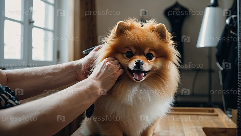 Груммер проверяет уши померанца - кисть, гребень, ножницы, экзамен пушистого шерсти, гигиена, спокойный интерьер, проверка состояния здоровья