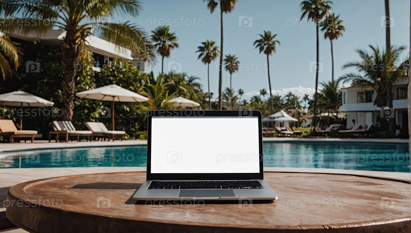 Ноутбук у бассейна, тропический курорт, пальма - отдых удаленная работа, свободное рабочее место, подключение к Wi-Fi, солнечная реклама деловых поездок