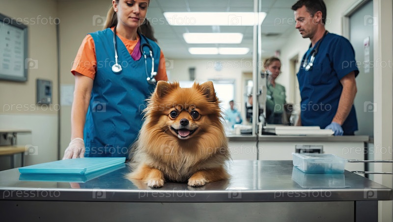 Собака за столом ветеринара - два ветеринарных врача, экзамены, вакцинация, стресс или спокойствие, физическая проверка, риски для здоровья породы