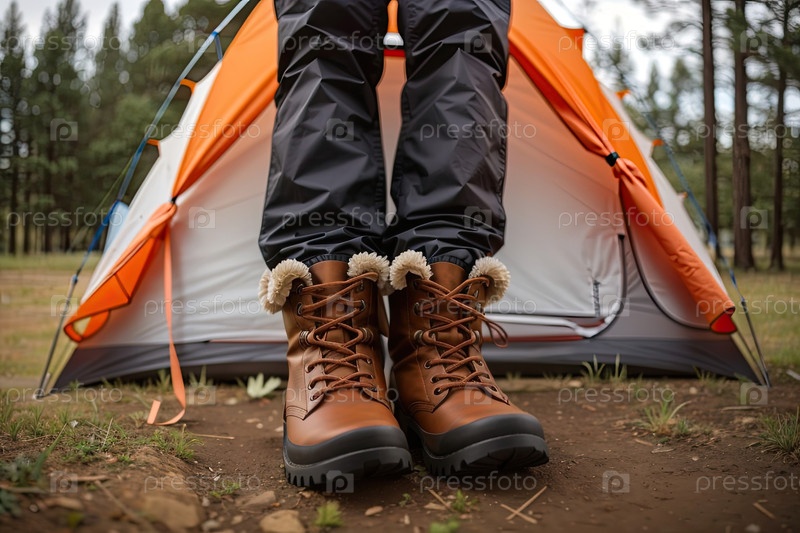 Кампинговые сапоги у входа в палатку, восход солнца кемпинг ? приключенческие путешествия, походы, туризм на открытом воздухе, рюкзак, промо-трэйл, туристический блог, баннер