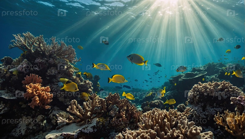 Широкая сцена коралловых рифов, блестящий океанский свет - семейный подводный туризм, эко-постер, баннер и фон морского исследования
