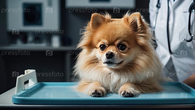 Пушистый помераньян у ветеринара - собака, лежащая на столе, клинический осмотр, проверка риска породы, вакцинация, спокойное или тревожное поведение
