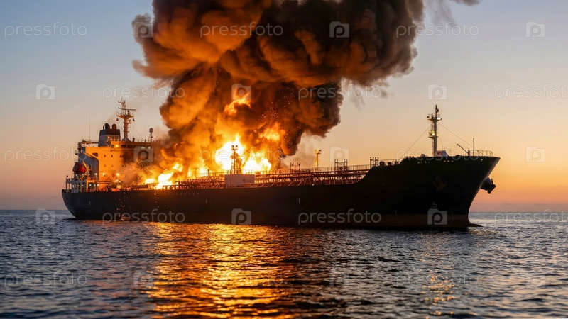 Нефтяной танкер горит с интенсивными пламенами и дымом