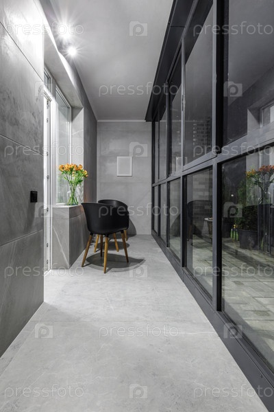 Длинный, современный закрытый балкон с изящными серыми плитками на полу и стене в эффекте камня.Пространство освещается встроенными потолочными прожекторами и включает минималистическую посадочную зону с черными стульями и прикосновением цвета от оранжевы