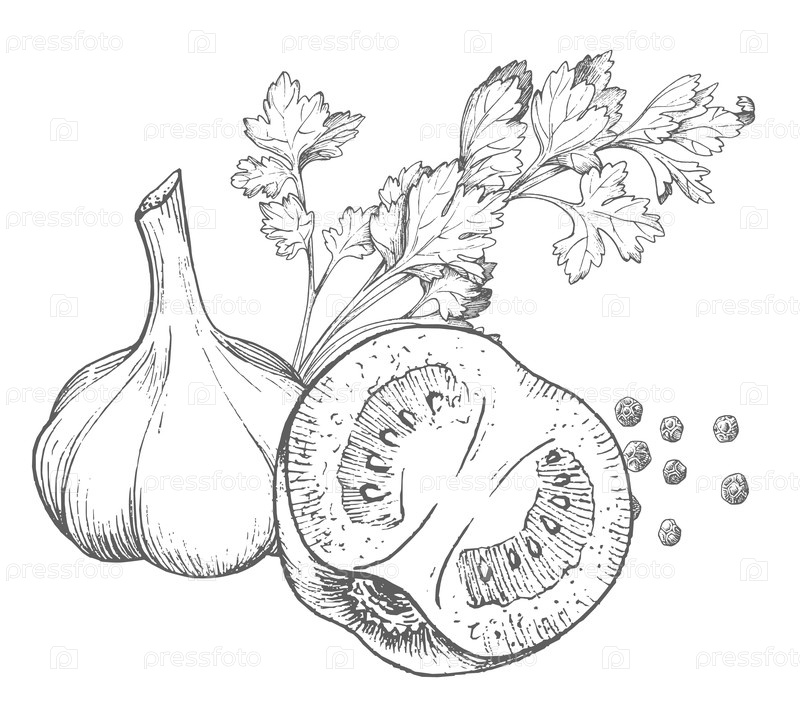 Состав помидоров, петрушки, зеленого лука и черного перца. Векторные цветные чернила в стиле ручной иллюстрации. Для дизайна упаковки, карточек, обложки, печатных изображений, этикеток на продуктах и ткани