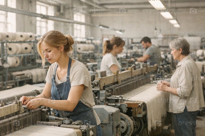 Текстильная фабрика: рабочие за ткацкими станками в производственном цехе, изготовление тканей и пряжи