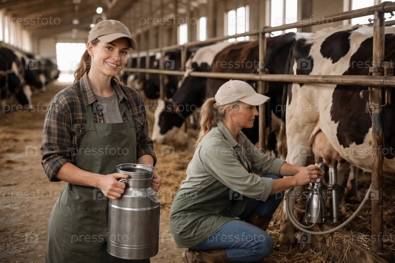 Две работницы молочной фермы доят коров в коровнике с использованием доильного аппарата, одна держит металлическую флягу для сбора свежего молока