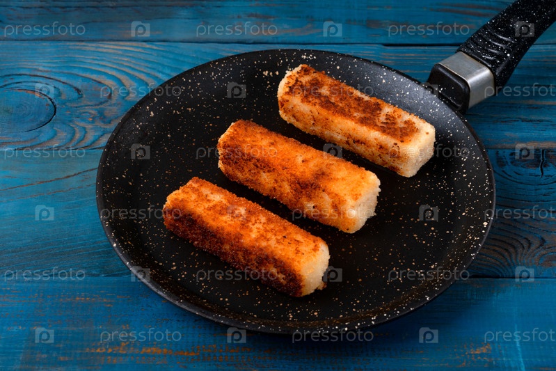 Рыбные палочки с хрустящим хлебом, жареные на черной сковородке на синем фоне