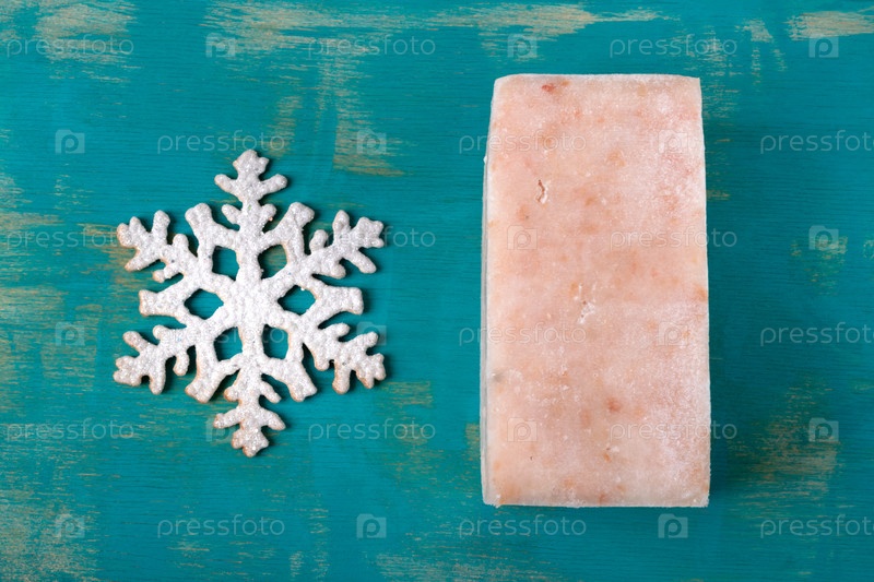 Замороженный блок измельченной белой рыбы и снежинки на бирюзовой деревянной доске. свежие ингредиенты морепродуктов в виде прессованных брикетов, вид сверху