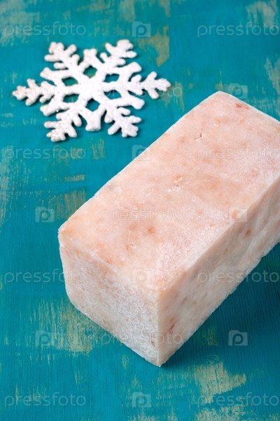 Замороженный блок измельченной белой рыбы и снежинки на бирюзовой деревянной доске. свежие ингредиенты морепродуктов в виде прессованных брикетов