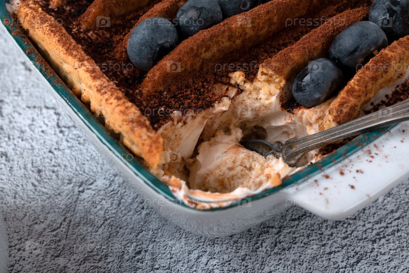 Традиционный японский сыромолочный торт из йогурта с печеньем, бисквитами и чернилами в керамической миске на сером фоне. Близкий план консистенции десерта