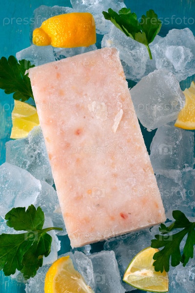 Замороженный блок измельченной белой рыбы, лимонных клинков и петрушки на льду