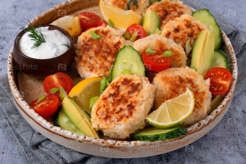 Жареные рыбные котлеты из бекона, сыра и трав подаются с свежими овощами, лимонными клинками и соусом кислой смеси на керамической тарелке на сером столе