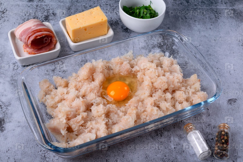 Молоченная белая рыба, куриное яйцо, бекон, сыр и травы на сером столе. Набор ингредиентов для приготовления котлетов из рыбы. Пошаговое приготовление пищи, шаг 1