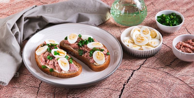 Вкусные бутерброды на зерновом хлебе с тунцом и перепелиным яйцем на тарелке на столе веб-баннер