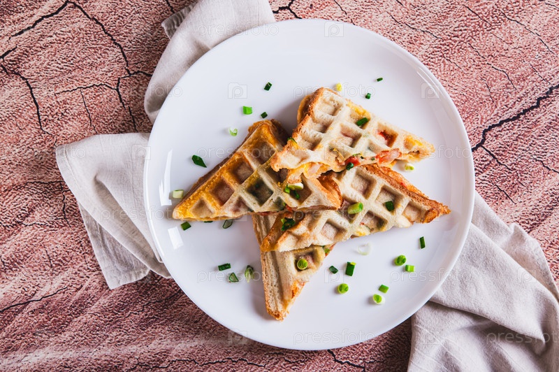 Близкий снимок тостов из вафли с ветчиной, сыром и помидорами на тарелке на столе