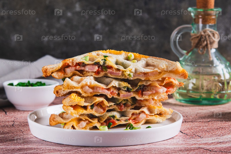 Стол вафлевых тостов с ветчиной, сыром, помидорами и зеленым луком на тарелке за столом