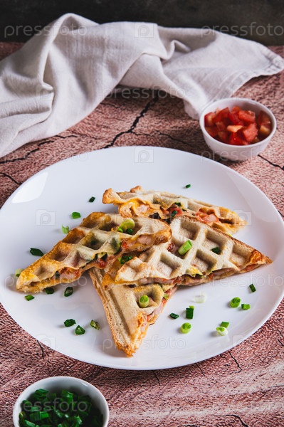 Бекон, сыр и помидоры выпечены в вафельном хлебе на тарелке на столе вертикальный вид