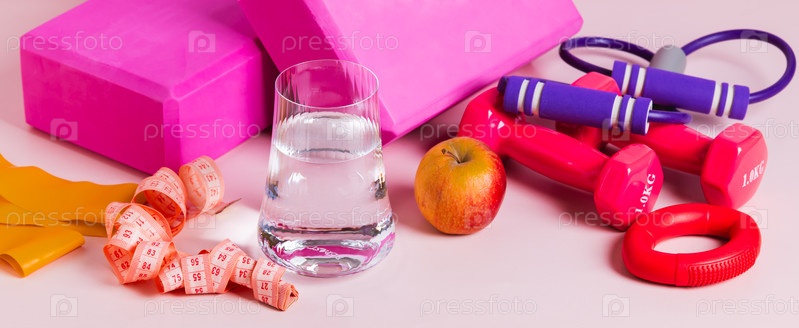 Концепция диеты и спорта, стакан воды, яблоко и спортивное оборудование на столе веб-баннер
